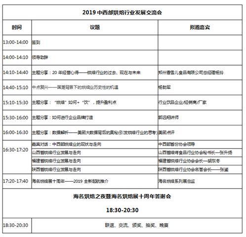 此次“2019中西部烘焙行业交流会暨海名烘焙展十周年客户答谢会”以“聚焦中西部·共谋新发展”为主题,旨在为中西部十省烘焙行业人士提供一个思想交流与碰撞的平台,共同探讨行业新形势、分析行业大数据、交流成功经验,会议特邀中西部十省烘焙行业领导、行业专家及烘焙行业原料、包装、设备等板块厂家、经销商就行业发展、技术趋势、成功案列、合作机遇等展开探讨与交流。