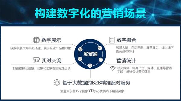 展贸通平台基于大数据的B2B精准配对,构建数字化的营销场景,以客户参与和订单为核心,以最少信息和操作步骤获取最多的行业领域买家数据接入,助力参展商拓展全球业务,开发新的效益增长点。