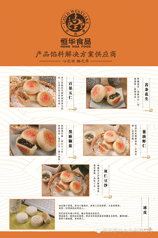 2004年以来,恒华公司投入巨大的人力、物力、精心开发研制的金西湖广式、苏式馅料获得了众多的知名厂家认可, “金西湖”这一品牌响彻长城内外,传遍大江南北。