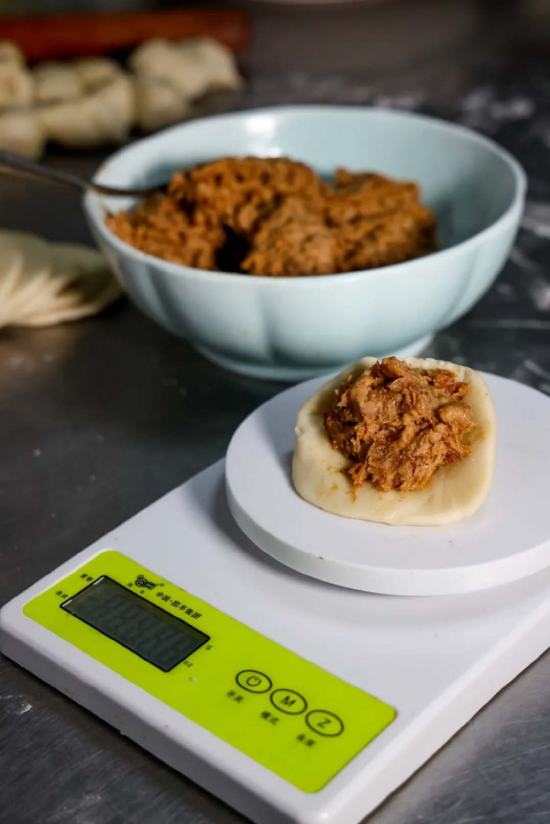 看着摆在橱窗里的鲜肉月饼,大小匀称、整齐划一,经询问,原来每一个肉月饼均保证面皮30g、肉馅35g。手艺熟练的老师傅,甚至不需要上称,仅凭着肉眼还有肌肉记忆就能精准掌握分量。
