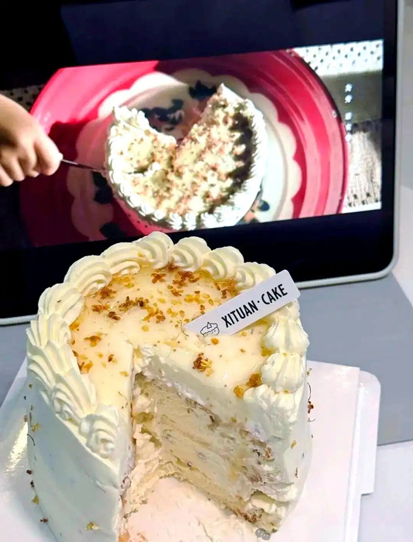 4、将桂花冻、桂花戚风和桂花奶油组合在一起,最后撒上一些干桂花进行装饰,一款迷人的xuyan同款桂花蛋糕就呈现在眼前了。